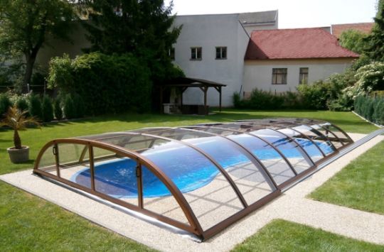 Toto posuvné zastřešení bazénu může mít nízkou nebo vysokou konstrukci.